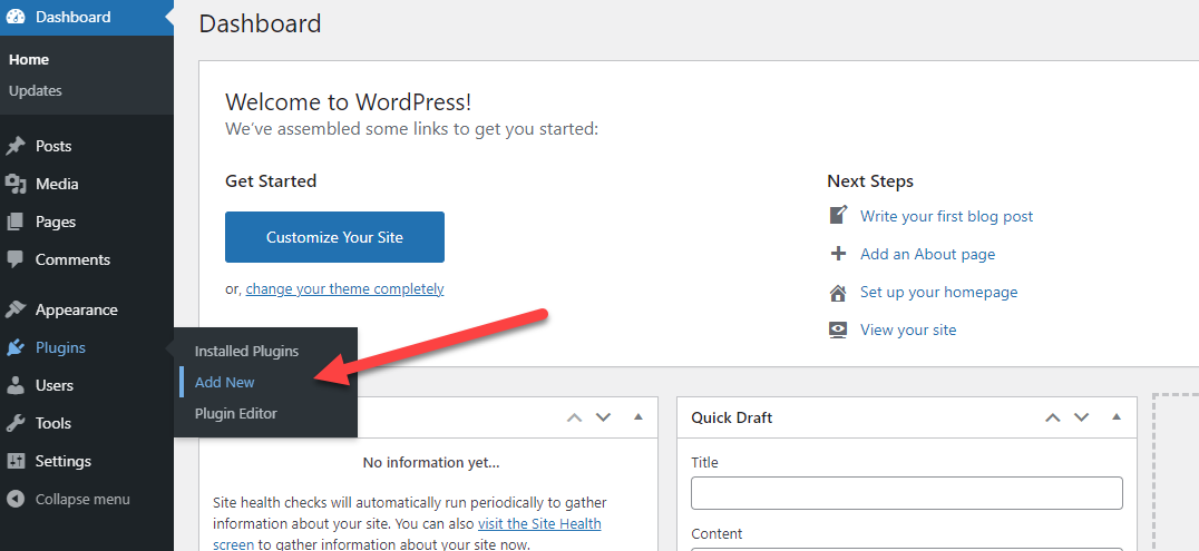 - Log in to your WordPress Admin Area. From the menu then go to Plugins > Add New.