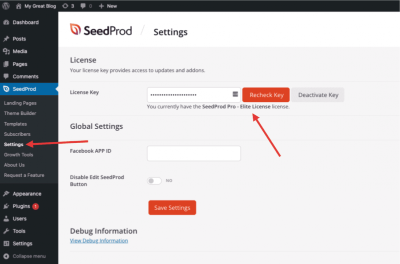 - You may also access you license key settings by going to SeedProd > Settings > License Key