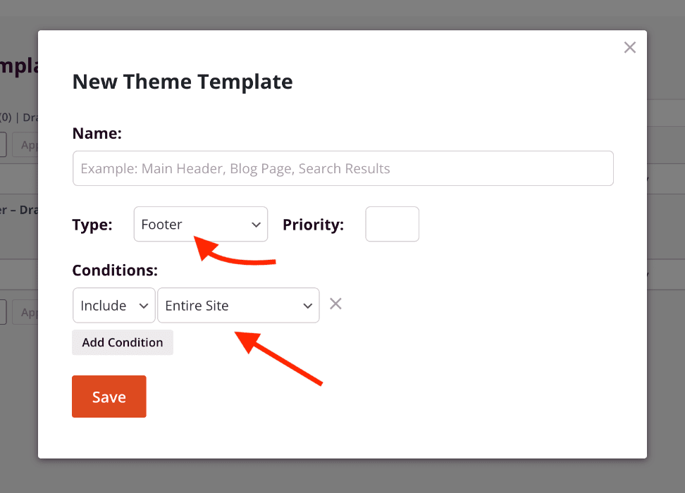 Like your header template, you can create a footer template by selecting the Footer Type option in the New Theme Template modal box. You may also set the footer template conditions and priority here to determine when and where this template will be shown.