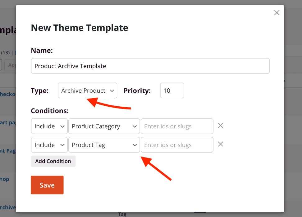 To create a product archive template for your product archive pages, select the Archive Product type option in the New Theme Template modal box and set up the theme conditions for this template. After completing your product archive template setup, click Save to begin designing your product archive template.