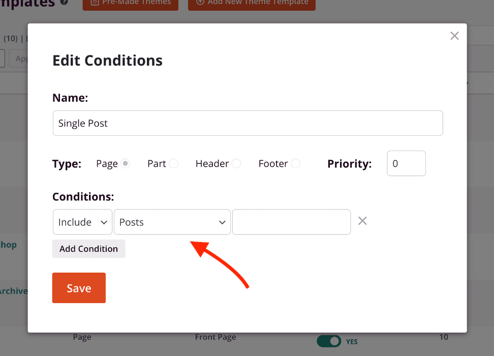Creating a single post template is just as easy using the same steps as creating a header/footer template. For this process, you’ll select the Single Post type option in the New Theme Template modal box and set up the conditions for this template. After completing your single post template setup, click Save to begin designing your single post template.