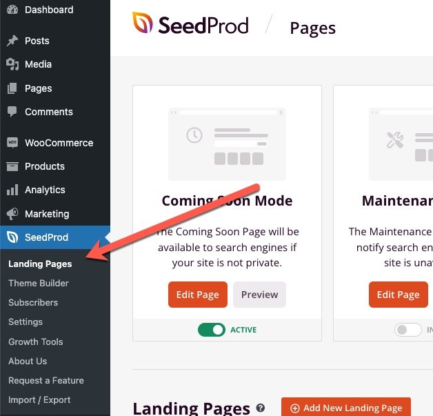 First, login to your WordPress dashboard and browse to “Landing Pages” under the SeedProd menu in the sidebar.