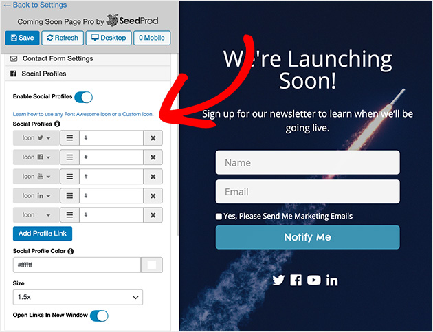 Before you launch, SeedProd can help you grow your social following by allowing visitors to share your website with their network. You can even reward them the more they share with referral tracking. This can create a viral loop!