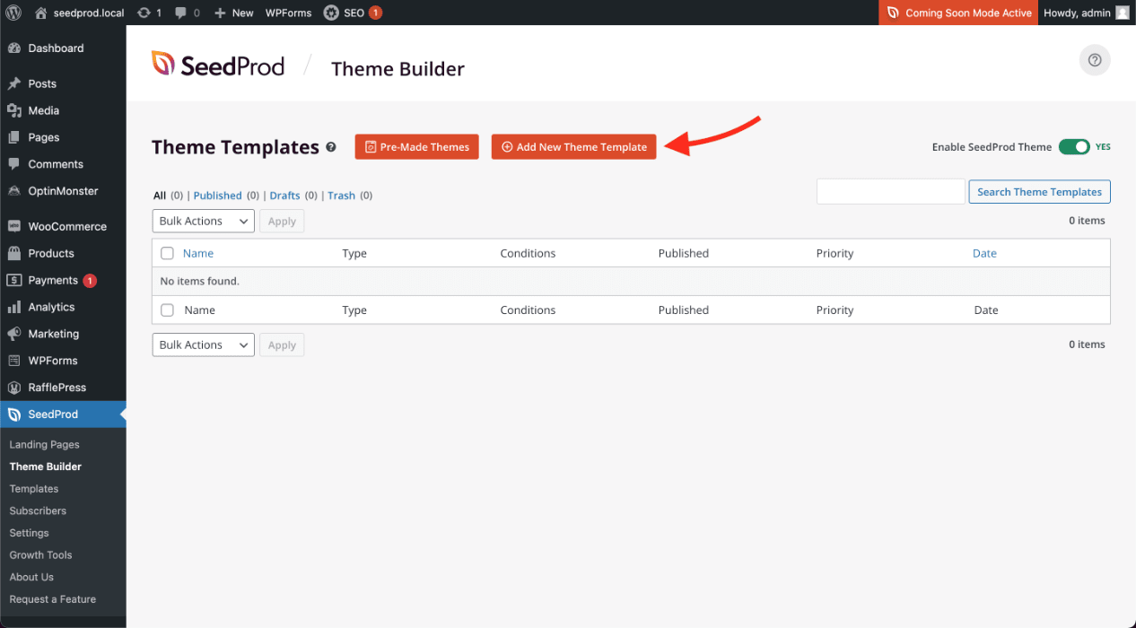 - Go to SeedProd > Theme Builder in your WP admin dashboard and click the Add New Theme Template button at the top of the page.