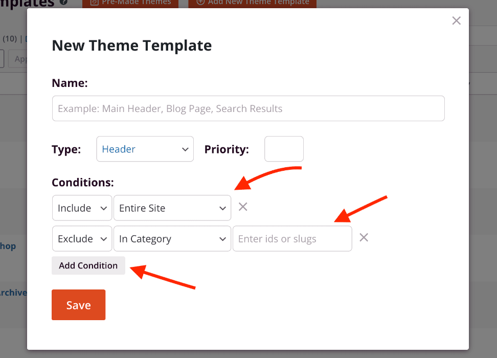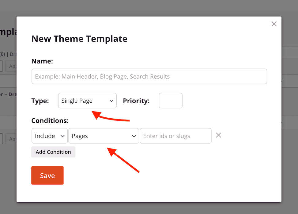 You can quickly set the template conditions for the new theme template under the Conditions section in the New Theme Template modal box. Within this modal box, you can set your include or exclude condition rules based on the available Type options. You may also drill down to a specific post, page, or taxonomy within the selected type using its slug or ID.