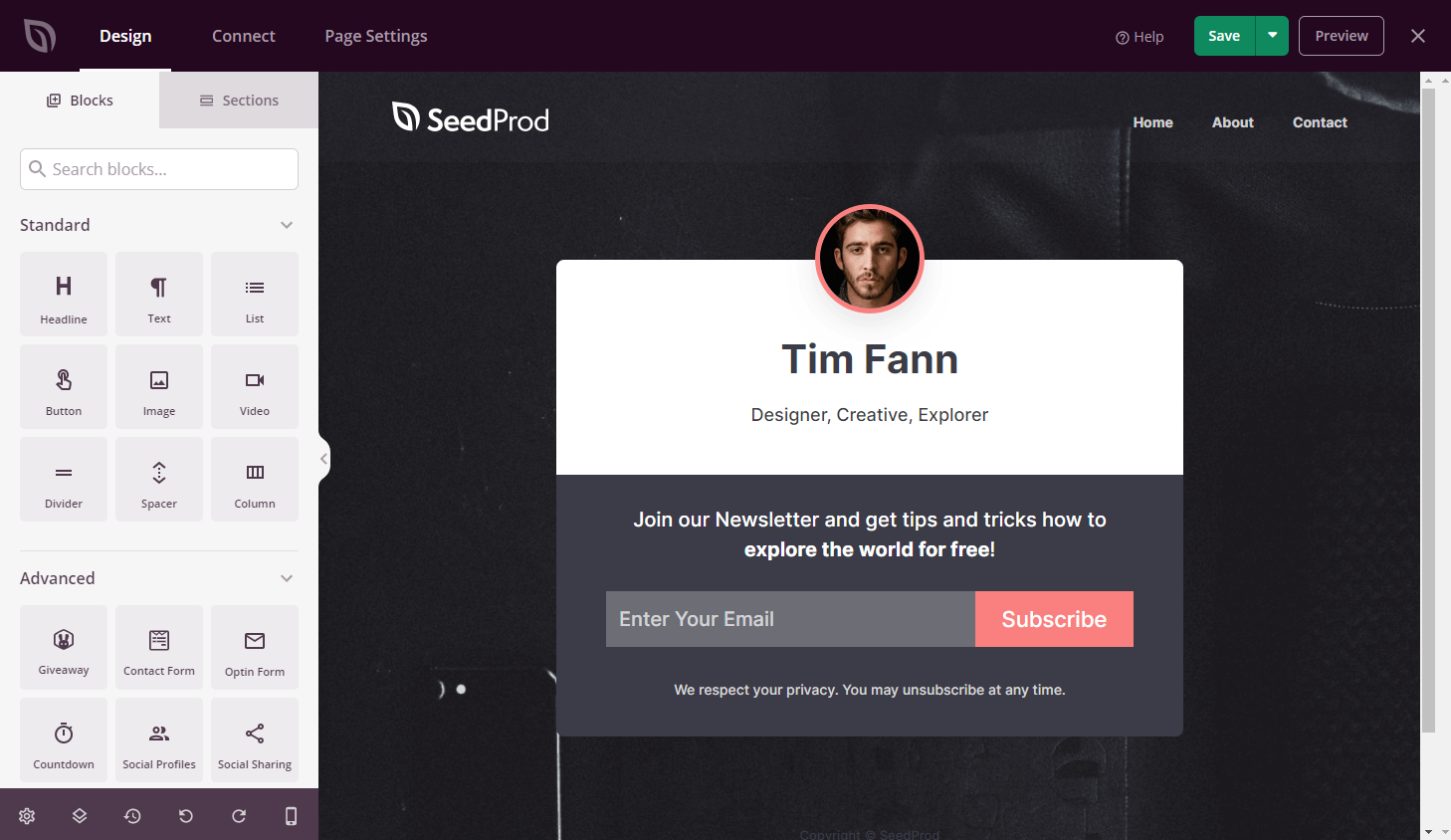 After importing your template, you will be presented with the SeedProd page builder. On the left you will see our blocks that you can drag and drop into the page on the right side.